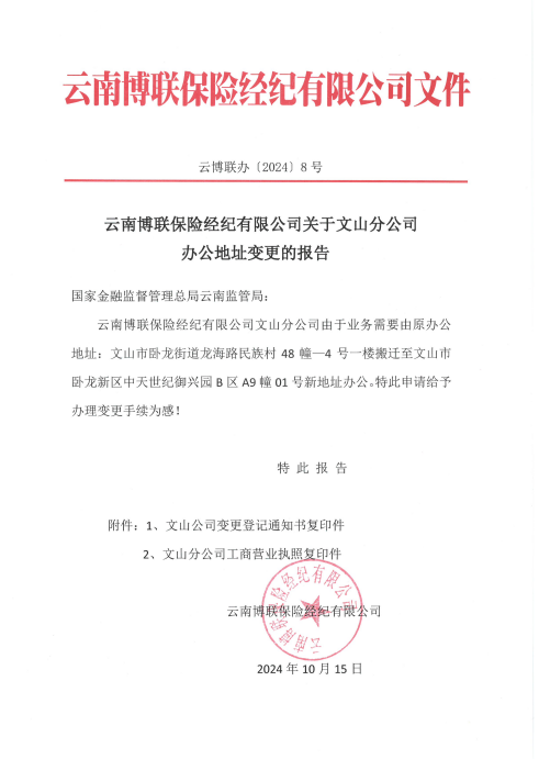 云南博聯(lián)保險經(jīng)紀有限公司關于文山分公司辦公地址變更的報告